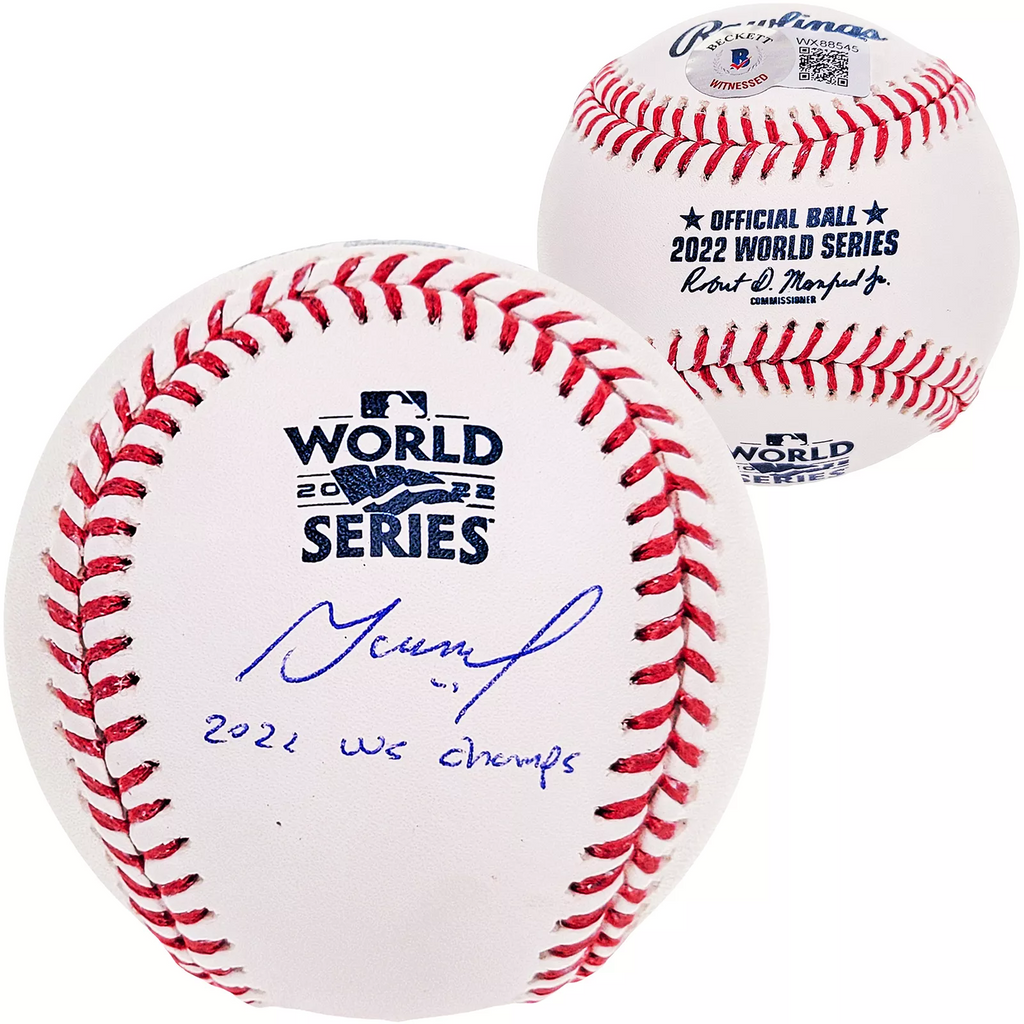 This is an Official 2022 World Series Logo MLB Baseball that has been hand signed by Jose Altuve. This item was inscribed "22 WS Champs." This item has been witnessed and certified authentic by Beckett Authentication (BAS) and comes with their tamper-proof witness sticker. Beckett Authentication has recently changed their physical certificate card policy where they no longer match their tamper-proof sticker with a physical certificate. A certificate can be printed on Beckett's website for the matching authentication number.