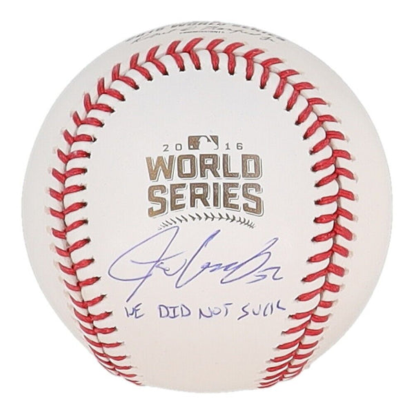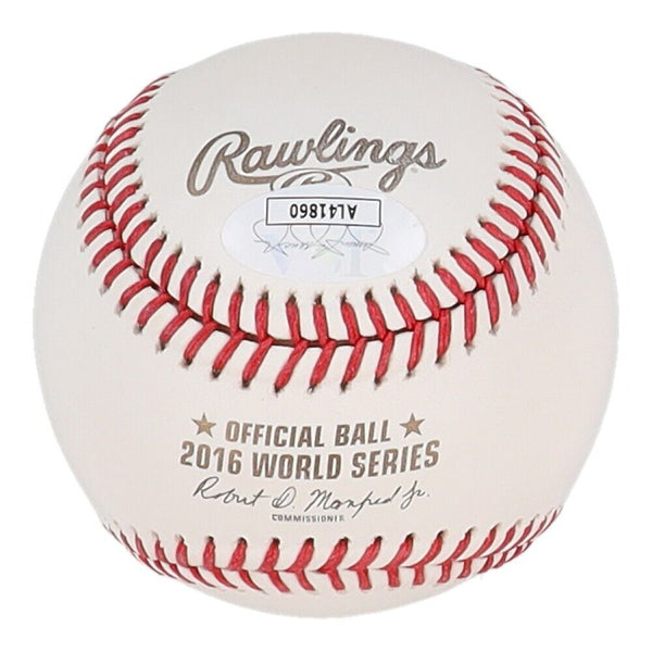 Rawlings Official 2016 World Series Logo baseball. Hand-signed and inscribed by Justin Grimm.The autograph includes an official James Spence Authentication (JSA) hologram and QR Code card for authenticity purposes. The signing of this item was witnessed by JSA.Authentication: JSA Hologram & QR Code card