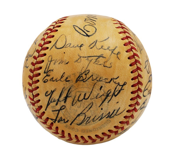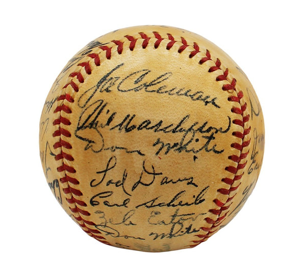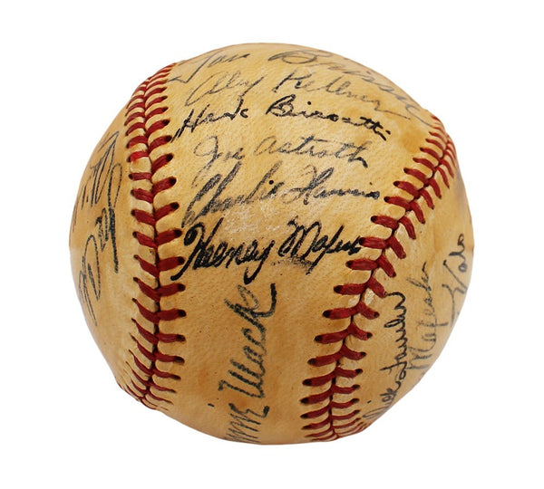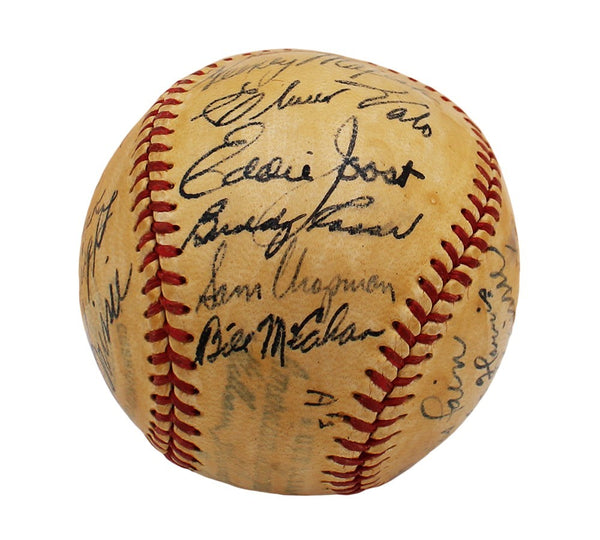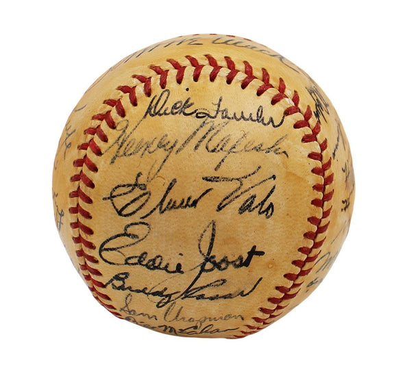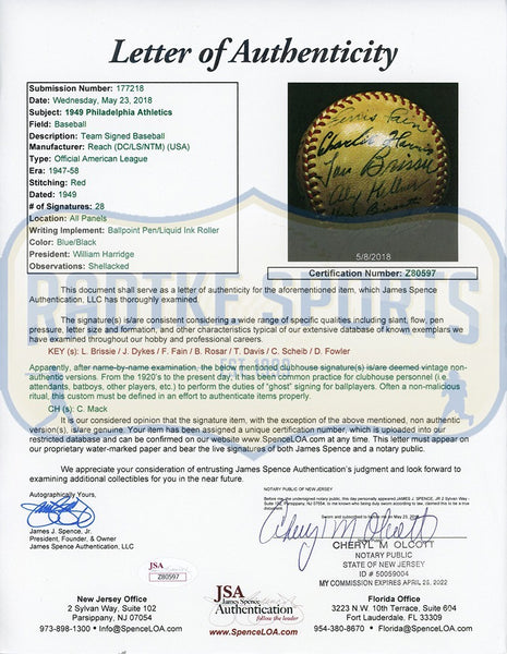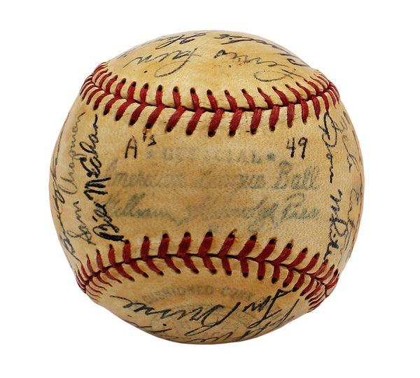 An Official American League MLB Baseball hand signed by 28 - 1949 Philadelphia Athletics players including Lou Brissie, Jim Dykes, Tod Davis, Carl Scheib, Ferris Fain, Dick Fowler Buddy Rosar and more. Apparently after name-by-name examination, Connie Mack is deemed vintage non-authentic version. From the 1920's to the present day, it has been common practive for clubhouse personnel (i.e. attendants, batboys, other players, etc.) to perform the duties of "ghost" signing for ball players. Often a non-malicious ritual, this custom must be defined in an effort to authenticate items properly. The item and signature are in excellent condition. AUTHENTICATION: The item is accompanied by a JSA Letter of Authenticity - JSA Serial Numbered and Databased Hologram.