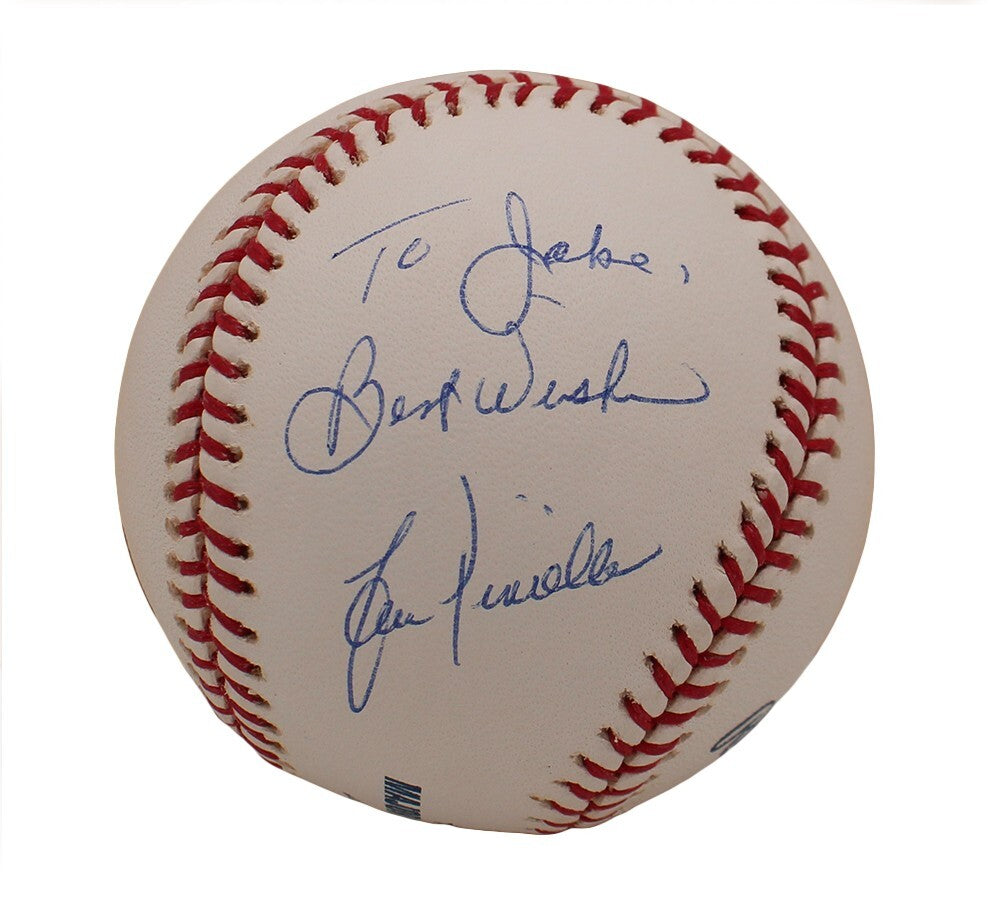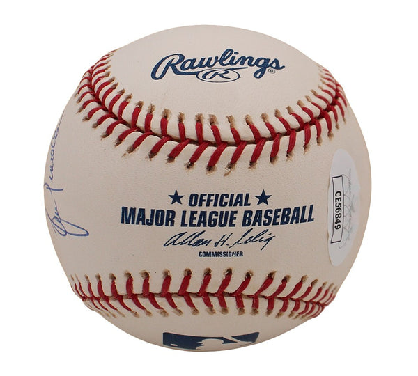 A New York Yankees Rawlings Official Major League White MLB Baseball hand signed by Lou Piniella. The item and signature are in excellent condition. In addition to signing his name Lou inscribed "To Jake Best Wishes" on the item. Lou was the 1969 AL Rookie of the Year and a two-time World Series champion as a player, later winning 1,835 games as a manager, including a 1990 World Series title with the Reds and a record-tying 116-win season with the Mariners in 2001. He was named Manager of the Year three times during his 23-season managerial career. AUTHENTICATION: The item is accompanied by a JSA Certificate of Authenticity - JSA Serial Numbered Hologram -