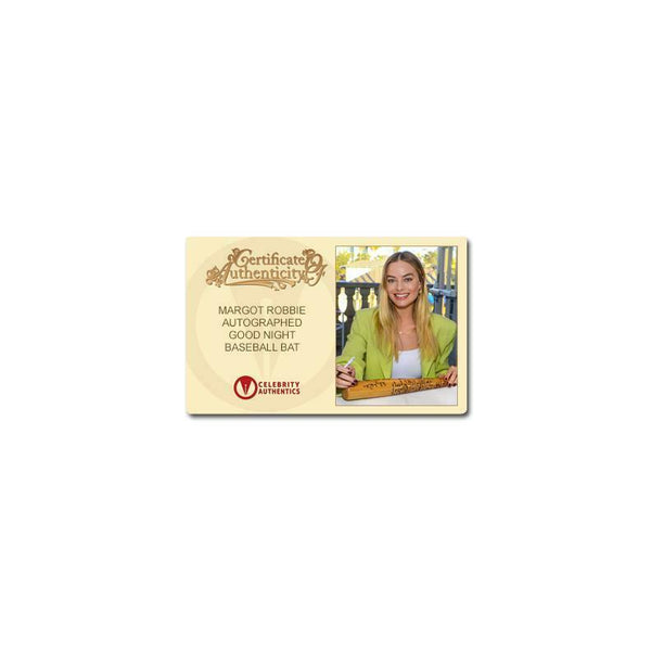 Celebrity Authentics is the exclusive autograph partner of Margot Robbie. Please be aware most other online autographs purported to be Ms. Robbie's are forgeries. Ms. Robbie has only signed with Celebrity Authentics so be sure the item you choose is affixed with the Celebrity Authentics Authentication Hologram for her genuine signature. This Officially Licensed Suicide Squad Harley Quinn Good Night Baseball Bat has been personally hand-signed by Margot Robbie during her exclusive autograph signing with Celebrity Authentics. Made of wood, bat measures 32" in length and features screen accurate markings. Say you were in a brawl with Harley Quinn, with her brandishing her favorite baseball-whacker. The first thing you'll notice about her weapon of choice are the big, friendly-looking letters etched into it, spelling out "GOOD NIGHT." The message isn't so friendly though, as you'll quickly find out. If you take a closer look at the lovely detailing on the bat, you'll notice everything else written on it. You might even get a chance to read some of it before you get bopped on the noggin and doze off to Dreamland. Of course, you could also just carry this official Good Night Bat around, which is just like the one Harley Quinn uses in Suicide Squad! This coveted prop replica ships affixed with Celebrity Authentics serial-numbered and tamper evident Authentication Hologram and includes Celebrity Authentics Certificate of Authenticity featuring picture of Margot signing bat. Please note: with multiples signed by the actor, a sample photo is used from stock to represent what you will receive. Exact autograph size and placement may vary.