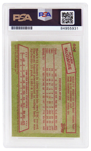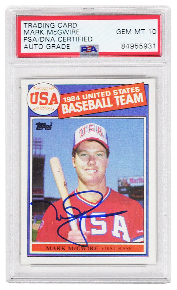 Mark McGwire signed Team USA 1985 Topps baseball rookie card #401. The card has been authenticated and encapsulated by PSA/DNA and the autograph has been given a GEM Mint 10 auto grade. The authentication number can be verified online. Only the autograph has been graded a 10 by PSA, the card itself is ungraded. The image of the item is a stock photo, as we may have multiples of the item in stock. The Slabbed Card you will receive will be of the card described. (Same grade, Same authentication) You may or may not receive the exact PSA serial number on the slab label shown in image.