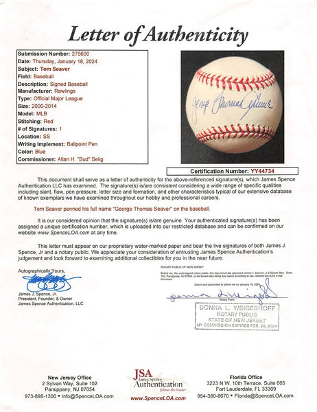 This Autographed Bud Selig Oml Baseball has been Personally Signed by George Thomas Seaver of the New York Mets. This item is 100% Authentic to include a Certificate of Authenticity (COA) / hologram by JSA. The authenticity can be verified on JSA website.