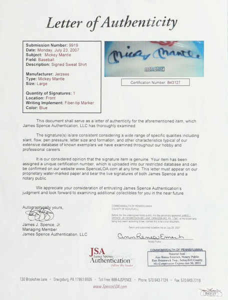 Featured is a Mickey Mantle signed limited edition air brushed Jerzees sweatshirt and is number 122/750. This shirt has been hand signed by Mantle and comes with the JSA hologram and letter of authenticity. This shirt is size L. This shirt would make a great addition to any sports memorabilia collection! SPECIFICATIONS Autographed By: Mickey Mantle Team: New York Yankees Sport: Baseball Authentication: James Spence Authentication (JSA)