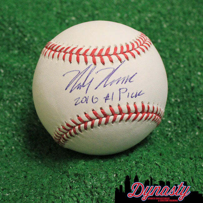 Mickey Moniak Autographed Los Angeles Angels Major League Baseball with '2016 #1 Pick' Inscription Signed Major League baseball from Angels star Mickey Moniak - includes Dynasty Sports certificate of authenticity This official Rawlings Major League baseball is autographed by 2016 #1 overall draft pick Mickey Moniak. All autographed memorabilia comes with a certificate of authenticity and matching hologram. Hand-Signed by Angels star Mickey Moniak Signature is in bold blue on the baseball Includes '2016 #1 Pick' inscription! Authenticated with Dynasty Sports serially numbered hologram and certificate during public autograph signing - guaranteed to pass JSA or PSA/DNA authentication Official MLB baseball