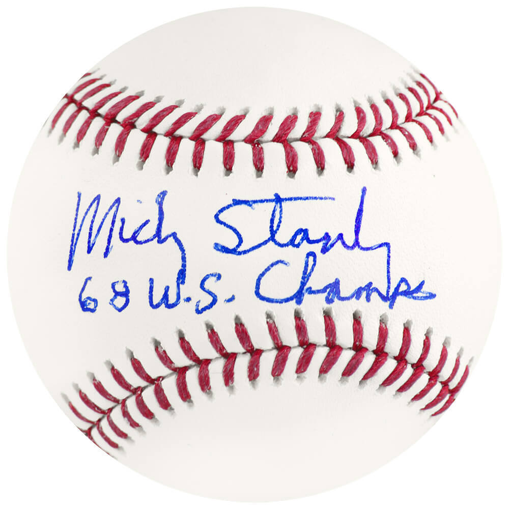 Mickey Stanley signed Rawlings official MLB baseball with '68 WSC' inscription. Item comes with a Schwartz Sports Memorabilia tamper-proof numbered hologram and Certificate of Authenticity which can be verified online.