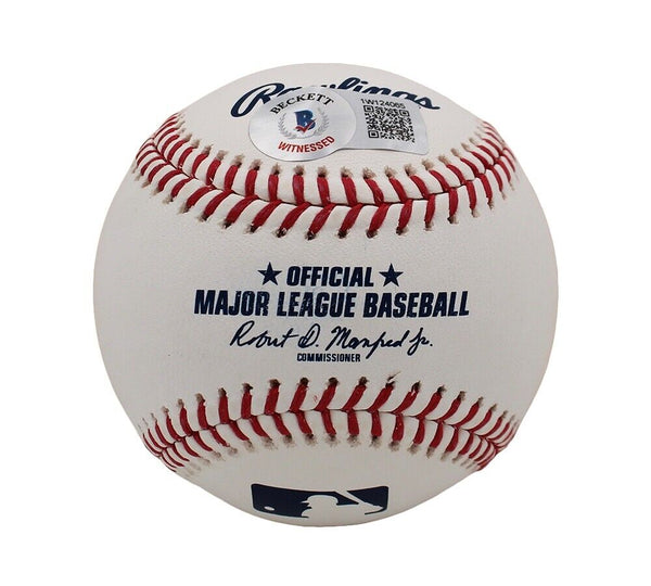 An Oakland Athletics Rawlings Official Major League White MLB Baseball hand signed by Miguel Tejada. The item and signature are in excellent condition. Miguel is a 6x All Star, and 2x Silver Slugger Award Winner. AUTHENTICATION: The item is accompanied by a Beckett Serial Numbered and Databased Hologram
