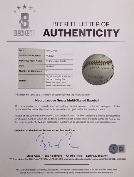 Featured is a Negro League legends baseball with 5 signatures. This baseball was hand signed by Mahlon Duckett, Stanley Glenn, Roberto Vargas, Jose Pereira, and Butch McCord and comes with the Beckett hologram and letter of authenticity. This item would make a great addition to any sports memorabilia collection!. SPECIFICATIONS Autographed By: Wilmer Harris Team: Sport: Baseball Authentication: Beckett Grading Services