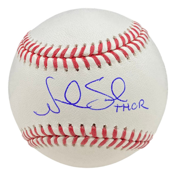 Featured is a Noah Syndergaard signed Rawlings official MLB baseball, inscribed "Thor". This baseball was hand signed by Syndergaard and comes with the Fanatics hologram and certificate of authenticity. This item would make a great addition to any sports memorabilia collection! SPECIFICATIONS Autographed By: Noah Syndergaard Team: Los Angeles Dodgers Sport: Baseball-MLB Authentication: Fanatics Authentic