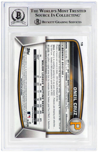 Oneil Cruz signed Pittsburgh Pirates 2023 Bowman baseball trading card #19. The card has been authenticated and encapsulated by Beckett Authentic and the autograph has been graded a Mint 10. The authentication number can be verified online. Only the autograph has been graded a 10 by Beckett Authentic, the card itself is ungraded.
