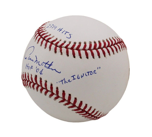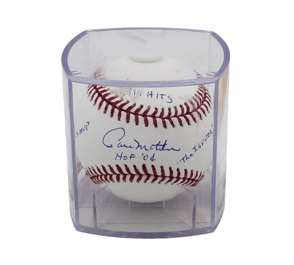 A Milwaukee Brewers Rawlings Official Major League White MLB Baseball with Display Cube hand signed by Paul Molitor. The item and signature are in excellent condition. In addition to signing his name, Paul also inscribed "The Ignitor, HOF 04, 3319 HITS, 93 WS MVP" Paul is a former professional baseball player and manager, a 7x All Star and a World Series Champion and World Series MVP. AUTHENTICATION: The item is accompanied by a PSA Serial Numbered and Databased Hologram.