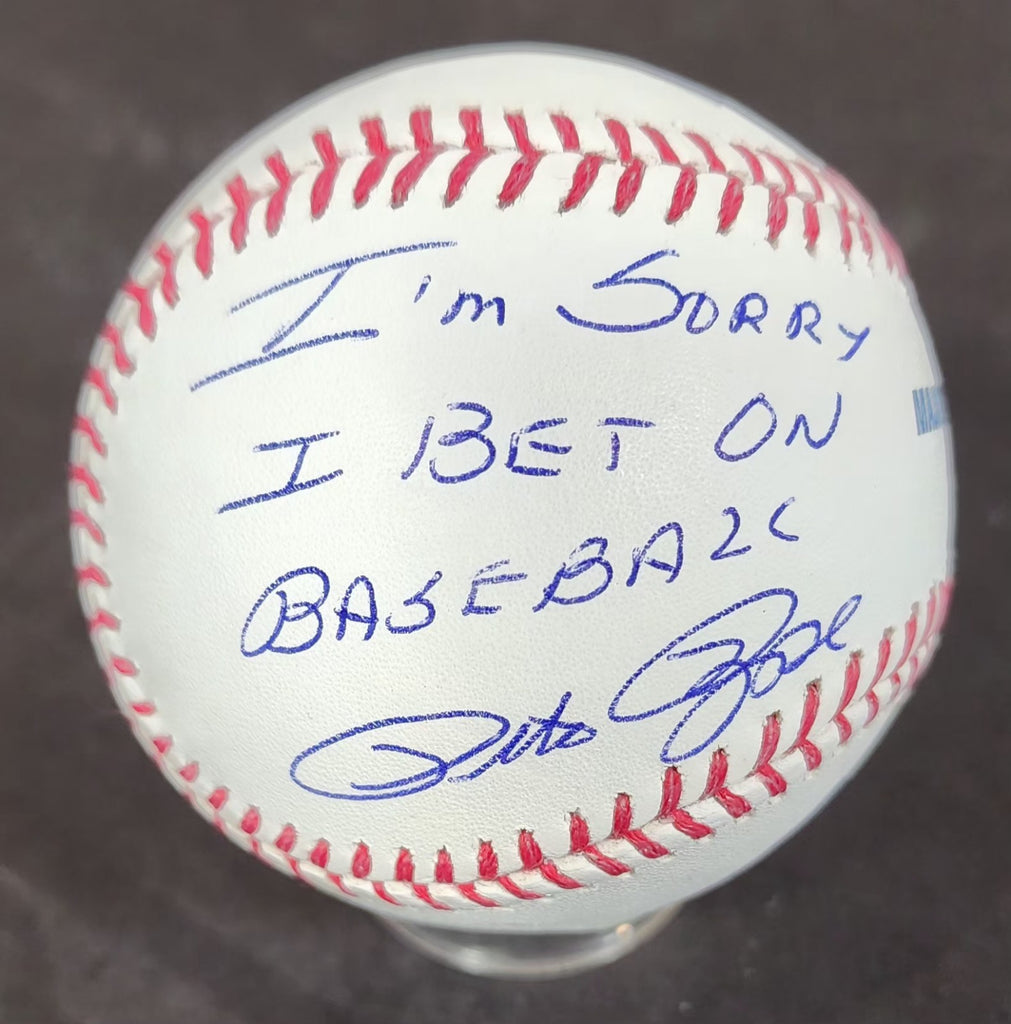 Very rare Pete Rose hand signed official MLB baseball, that he inscribed with the message "I'm Sorry I Bet On Baseball". The signature is authenticated by Fanatics verified with the number 0446908 as shown in picture.