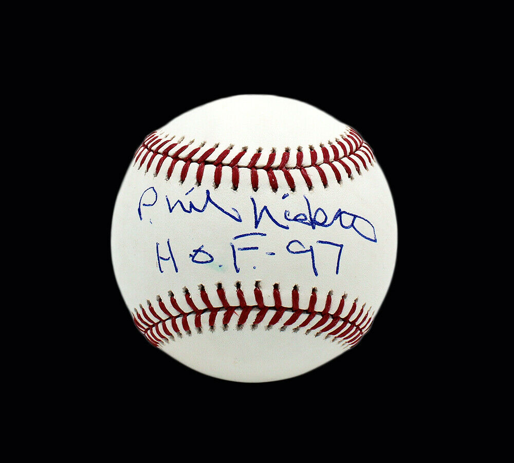 An Atlanta Braves Rawlings Official Major League White MLB Baseball hand signed by Phil Niekro. The item and signature are in excellent condition. In addition to signing his name, Phil also inscribed "HOF 97" on the item. Phil is a former MLB Pitcher, He played 20 seasons for the Atlanta Braves. He is a 5x All-Star, 5x Gold Glover Award winner & 2x NL Wins leader. AUTHENTICATION: The item is accompanied by a Certificate of Authenticity - Serial Numbered and Databased Hologram