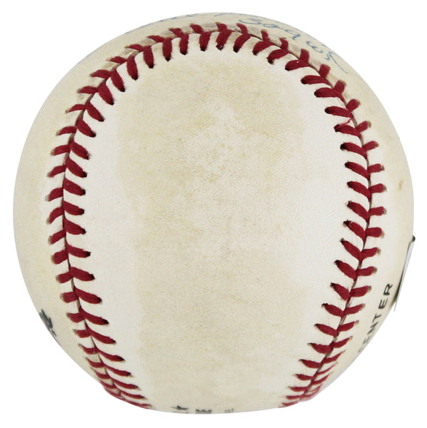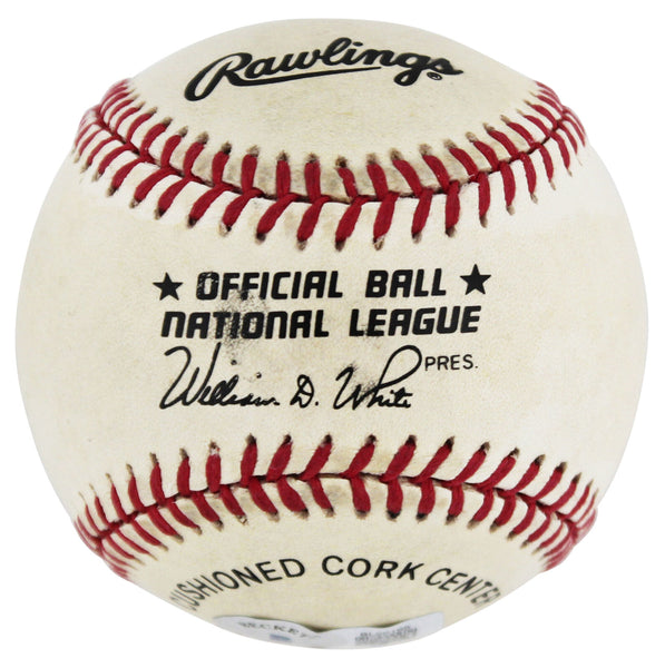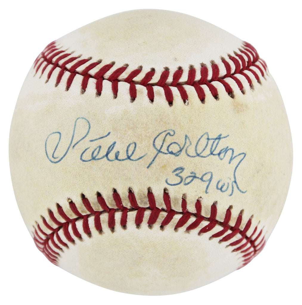 This Autographed William White Onl Baseball with the inscription of "329 W's" has been Personally Signed by Steve Carlton of the Philladelphia Phillies. This item is 100% Authentic to include a Certificate of Authenticity (COA) / hologram by Beckett Authentication Services. The authenticity can be verified on Beckett Authentication Services website. Each ball has a thumbprint of Steve Carlton , the photo in the case is also signed and has Steve Carlton signature, though the Beckett COA does not cover both signatures. These vintage balls all have some varying degrees of spotting and toning. We are not able to guarantee the coloring of the ball, and the number of the edition you may receive.