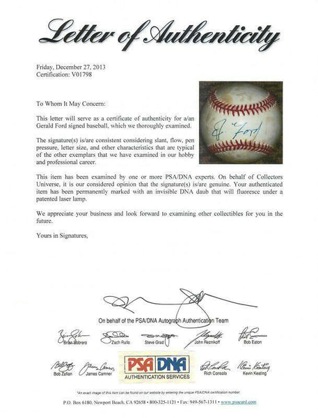 This PRESIDENT GERALD FORD SIGNED AUTHENTIC ONL WILLIAM WHITE BASEBALL AUTOGRAPHED PSA/DNA #V01798 has been certified authentic. It will include the PSA/DNA numbered hologram and matching Certificate of Authenticity.