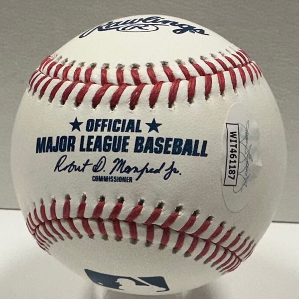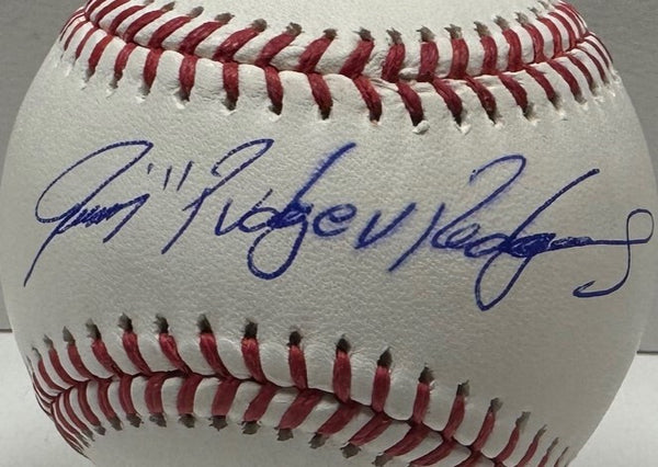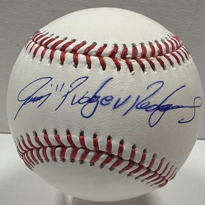 An official Major League Manfred commish Baseball hand signed by Texas Rangers Hall of Famer IVAN RODRIGUEZ. The signature is in blue ink pen with the inscription "Pudge". This baseball was signed at a private signing with us. This would make a great addition to any Rodriguez or Rangers collection! This item is guaranteed to be 100% authentic and will include a COA from JSA (James Spence Authentication) with matching serial numbers.