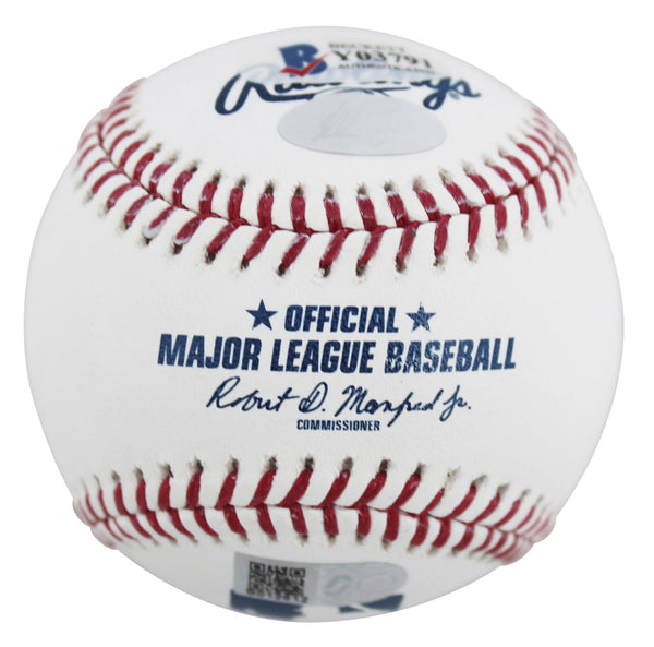 This Autographed Robert Manfred Oml Baseball with the inscription of "HOF 99" has been Personally Signed by Nolan Ryan of the Texas Rangers. This item is 100% Authentic to include a Certificate of Authenticity (COA) / hologram by Beckett Authentication Services. This is a stock item in which we have several available. The one you will receive will be of equal quality to the one pictured. This item can be verified through BAS.