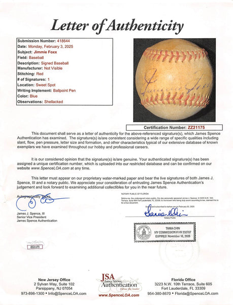 This Autographed Baseball with the inscription of "To Joe Rielly" has been Personally Signed by Jimmie Foxx of the Boston Red Sox. This item is 100% Authentic to include a Certificate of Authenticity (COA) / hologram by JSA. The authenticity can be verified on JSA website.