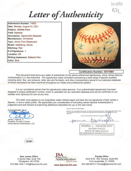 This Autographed Jimmie Foxx Restaurant Mini Baseball has been Personally Signed by Jimmie Foxx of the Boston Red Sox. This item is 100% Authentic to include a Certificate of Authenticity (COA) / hologram by JSA. The authenticity can be verified on JSA website.