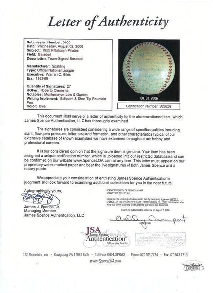 Featured is a Featured is a 1955 Pittsburgh Pirates team signed official National League baseball. Most notable on this ball are: Roberto Clemente (Rookie), Dick Groat, Bob Friend, Elroy Face, Felipe Montemayor, Vern Law, Sid Gordon, Frank Thomas, Dale Long, Bob Purkey, Jerry Lynch, Nelson King, Dick Smith, Dick Littlefield, Jack Shepard, Roman Mejias, Toby Atwell, Hardy Peterson, Al Grunwald, George Freese, Gene Freese, Dick Cole, and Tom Saffell. This ball comes with the JSA hologram and letter of authenticity. This ball would make a great addition to any sports memorabilia collection!. SPECIFICATIONS Autographed By: Team: Sport: Baseball Authentication: James Spence Authentication (JSA)