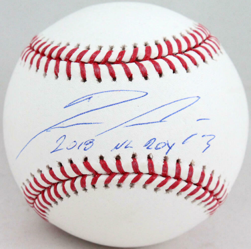 Ronald Acuna Autographed Rawlings OML Baseball w/ 2018 NL ROY/ # - Beckett W *Blue This is a Ronald Acuna hand autographed Rawlings Official Game Ball Major League Baseball inscribed with 2018 NL Roy. This item has a Beckett Witnessed Authentication, which comes with a numbered and a matching Certificate of Authenticity. You can view this item on the Beckett website and it shows when and where the item was signed. It was signed either at a public autograph appearance or a private signing. This is a stock photo of the item. Although you may not receive this exact item, the item you receive is virtually identical, brand new, and in great shape.
