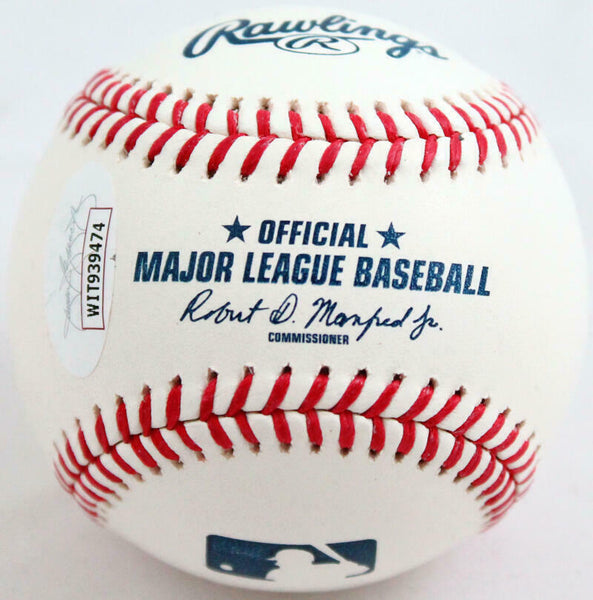 Roy Oswalt Autographed Rawlings OML Baseball w/The Wizard- JSA W *Blue This is a hand autographed Baseball of Roy Oswalt. This is a Rawlings Official Game Ball Major League Baseball. Inscribed with The Wizard. This item has a James Spence Witness Protection Authentication, which comes with a JSA numbered sticker and a matching JSA Certificate of Authenticity. You can view this item on the SpenceLOA website. It was signed either at a public autograph appearance or a private signing. This is a stock photo of the item. Although you may not receive this exact item, the item you receive is virtually identical and brand new in great shape.