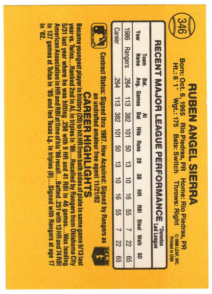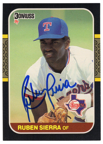 Ruben Sierra signed Texas Rangers 1987 Donruss rookie baseball trading card #346. Item comes with a Schwartz Sports Memorabilia tamper-proof numbered hologram (on back of physical card) and Certificate of Authenticity which can be verified online.