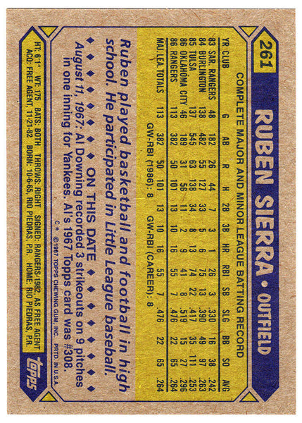 Ruben Sierra Signed Rangers 1987 Topps Rookie Baseball Card #261 -(SCHWARTZ COA)