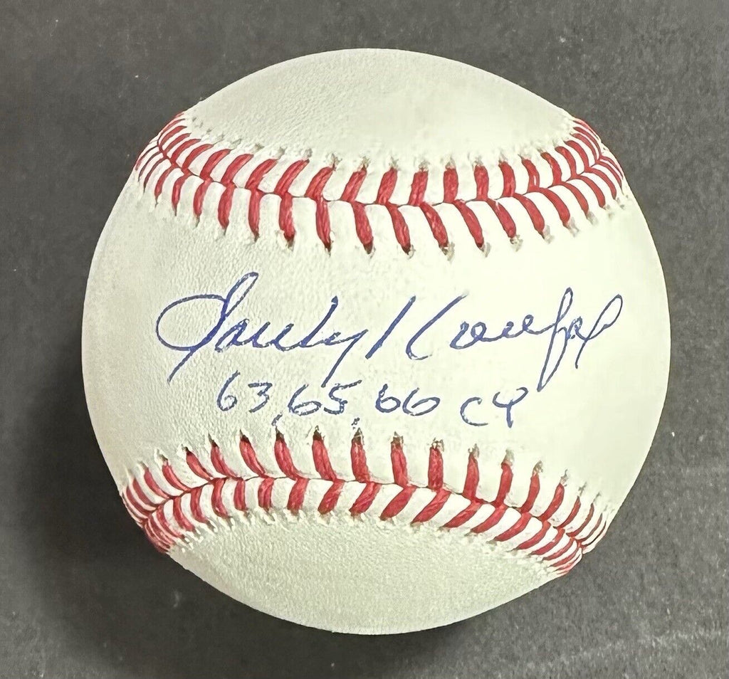 Incredible Sandy Koufax hand Signed Official MLB Baseball Dodgers 3 Cy Young years hand written out by Koufax bold mint clean Autograph Fanatics and MLB COA. Certified Hand signed in bold blue on the sweet spot of the ball and inscribed "63,65,66 CY". Koufax won the NL Cy Yount award in 1963, 1965 and 1966. One of the best pitchers ever... domination !!! Hall of Famer. Rawlings official baseball. Great inscription you GET THIS EXACT BASEBALL RARE INSCRIPTIONS !!!