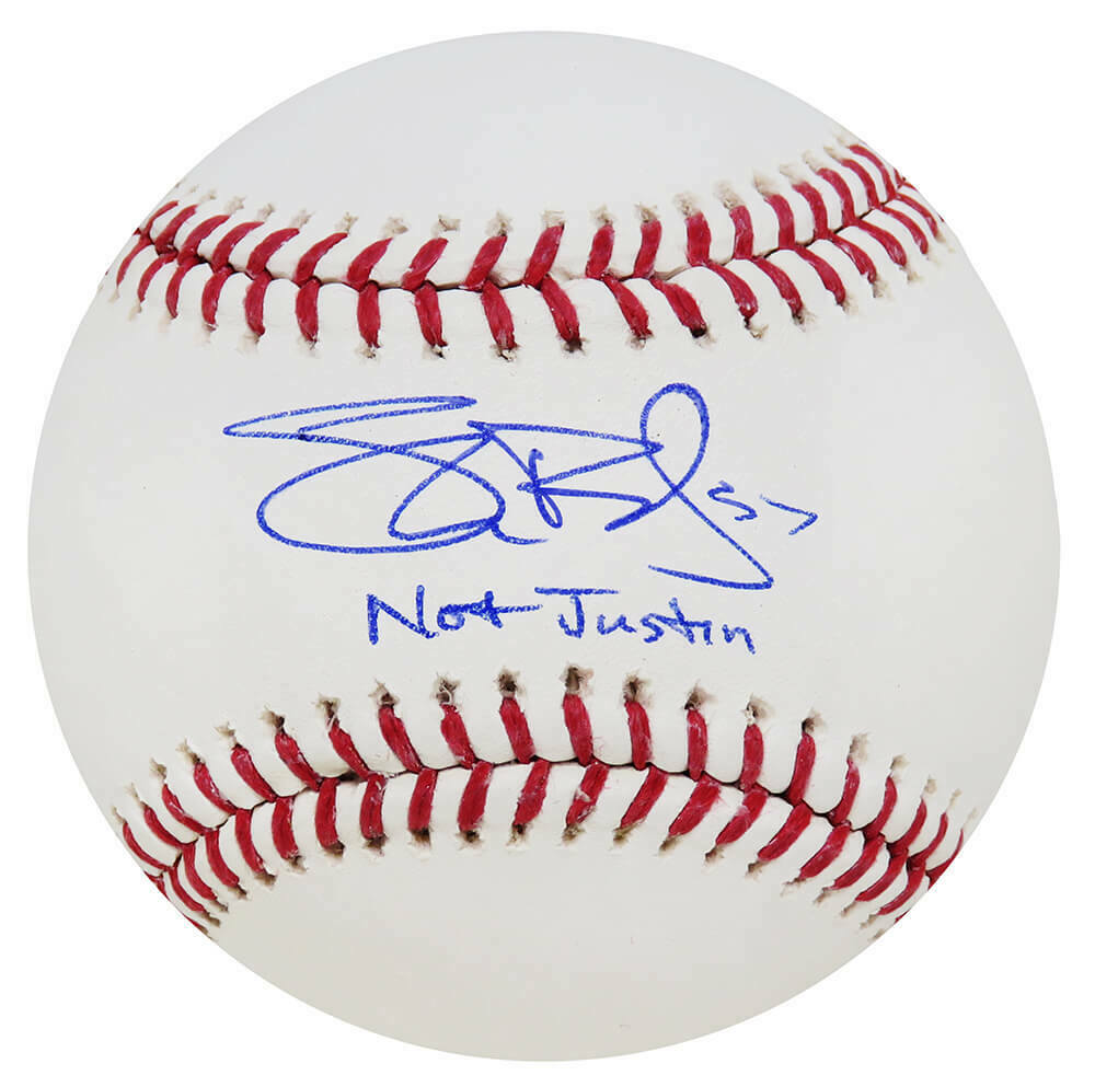 Shane Bieber signed Rawlings official MLB baseball with 'Not Justin' inscription. Item comes with a Beckett Authentication tamper evident numbered sticker and matching Certificate of Authenticity which can be verified online.