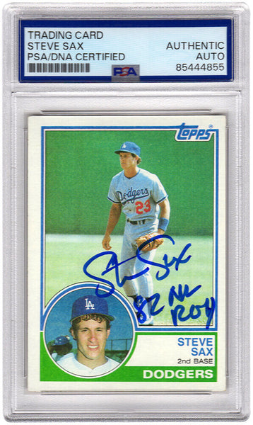 Steve Sax Signed Los Angeles Dodgers 1983 Topps baseball trading card #245 with '82 NL ROY' inscription. The card has been authenticated and encapsulated by PSA/DNA and the number can be verified online.