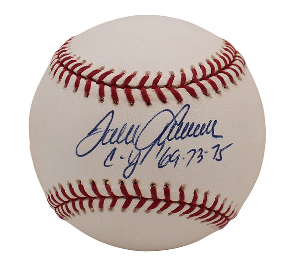 A New York Mets Rawlings Official Major League White MLB Baseball hand signed by Tom Seaver. The item and signature are in excellent condition. In addition to signing his name, Tom also inscribed "CY '69-73-75" on the item. Tom is a former professional baseball player who played 20 season in the MLB. AUTHENTICATION: The item is accompanied by a JSA Certificate of Authenticity - JSA Serial Numbered Hologram -