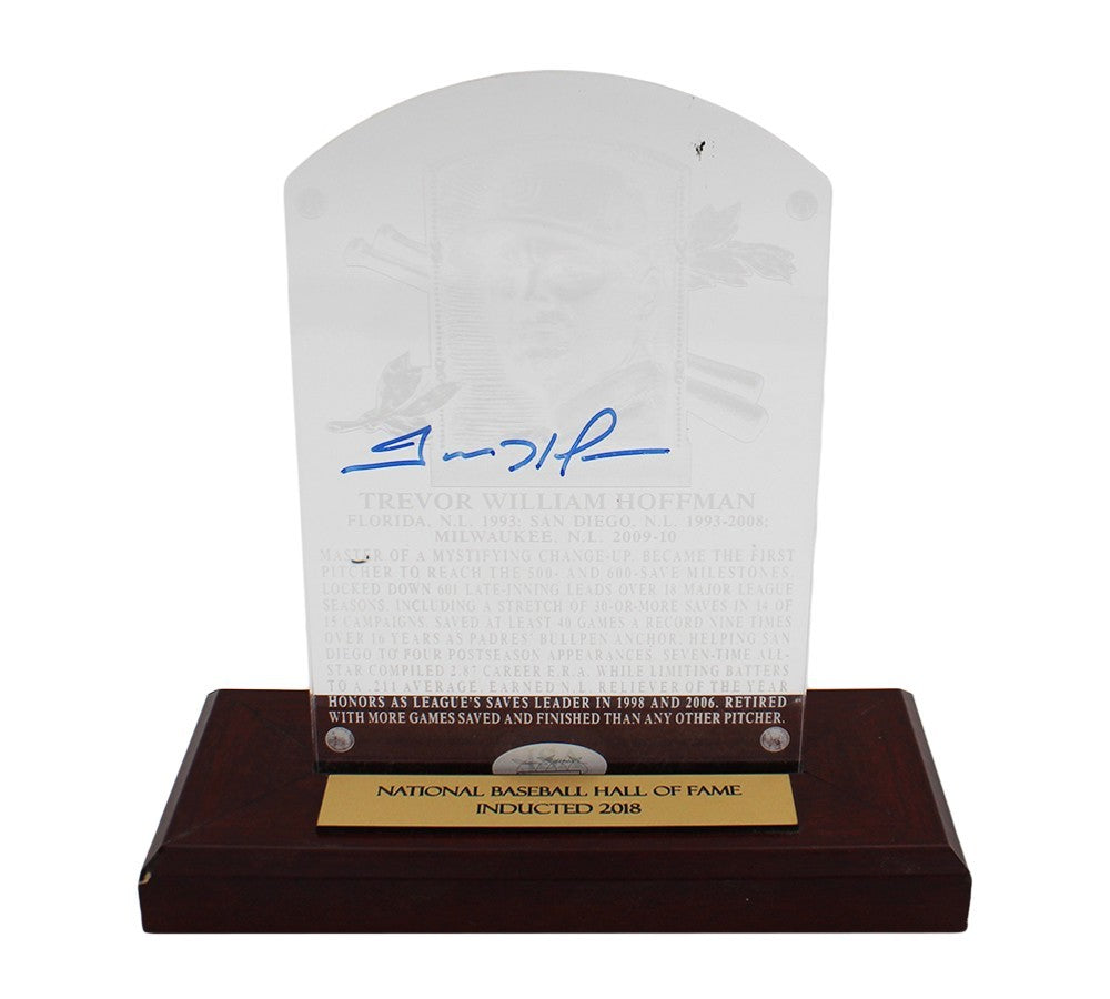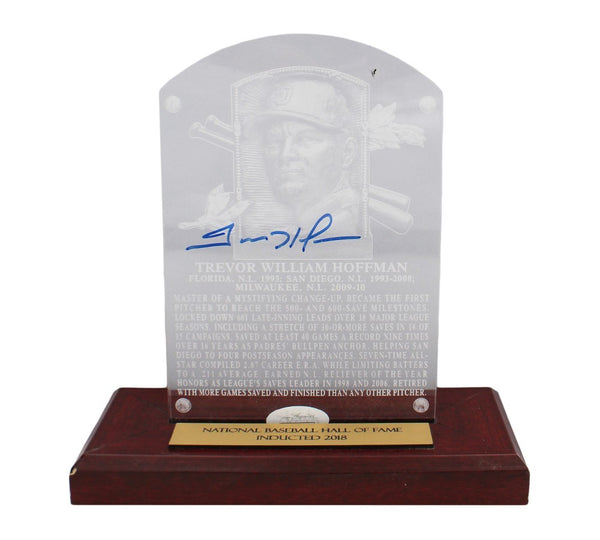 A National Baseball Hall of Fame Plaque with Stand hand signed by Trevor Hoffman. The item and signature are in excellent condition. Tevor is a former professional Baseball player. He spent 18 seasons in the major leagues. He was inducted into the Hall of Fame in 2018. AUTHENTICATION: The item is accompanied by a JSA Certificate of Authenticity - JSA Serial Numbered and Databased Hologram