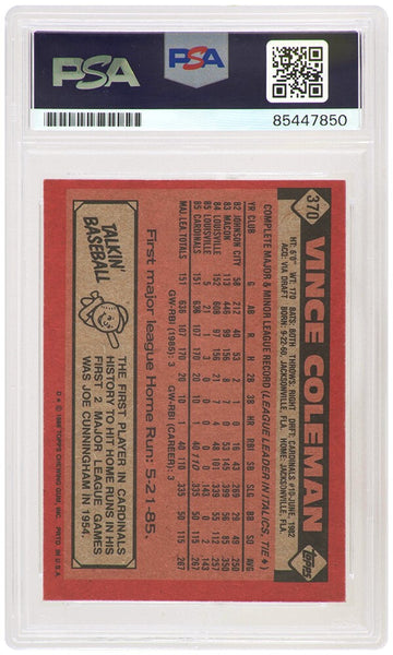 Vince Coleman signed St. Louis Cardinals 1986 Topps baseball trading card #370. The card has been authenticated and encapsulated by PSA/DNA and the authentication number can be verified online.