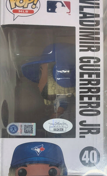 Vladimir Guerrero Jr has autographed this funko. Autograph is authenticated by JSA (James Spence Authentication) the worldas leading authenticator of sports autographs. Comes with their unique sticker # fixed to the item and verified on their website. Also comes with their certificate of authenticity with same matching #.