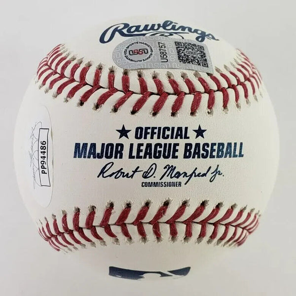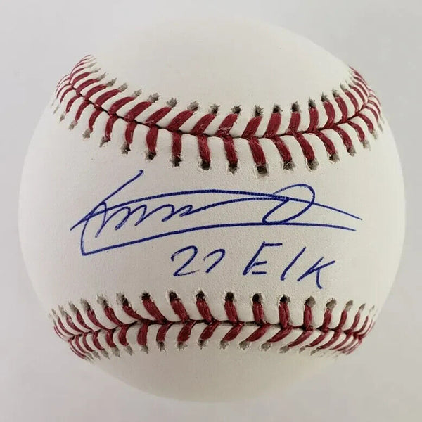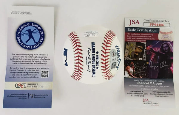 This autographed OML baseball has been personally hand-signed by Vladimir Guerrero Jr. ("Elk" inscription) of the Toronto Blue Jays.This autograph is certified by James Spence Authentication (JSA). It comes with the numbered hologram and matching Certificate of Authenticity.It is also certified by USA Sports Marketing. It comes with the numbered hologram and matching Certificate of Authenticity.