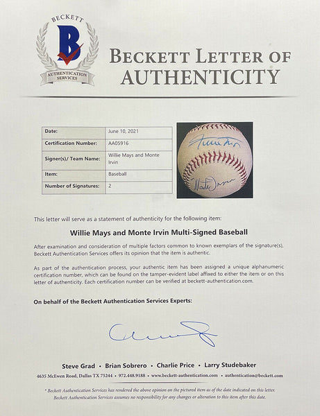 Featured is a Willie Mays & Monte Irvin dual signed baseball. This baseball was hand signed by Willie Mays & Monte Irvin and authenticated by Beckett authentication services. Included with the baseball is Beckett hologram and letter of authenticity. This item would make a great addition to any sports memorabilia collection!.. SPECIFICATIONS Autographed By: Willie Mays Team: Giants Sport: Baseball Authentication: Beckett Grading Services