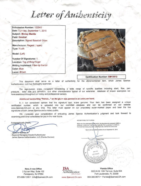 This Autographed Youth Regent 5114 Baseball Glove has been Personally Signed by Mickey Mantle of the New York Yankees. This item is 100% Authentic to include a Certificate of Authenticity (COA) / hologram by JSA. The authenticity can be verified on JSA website.