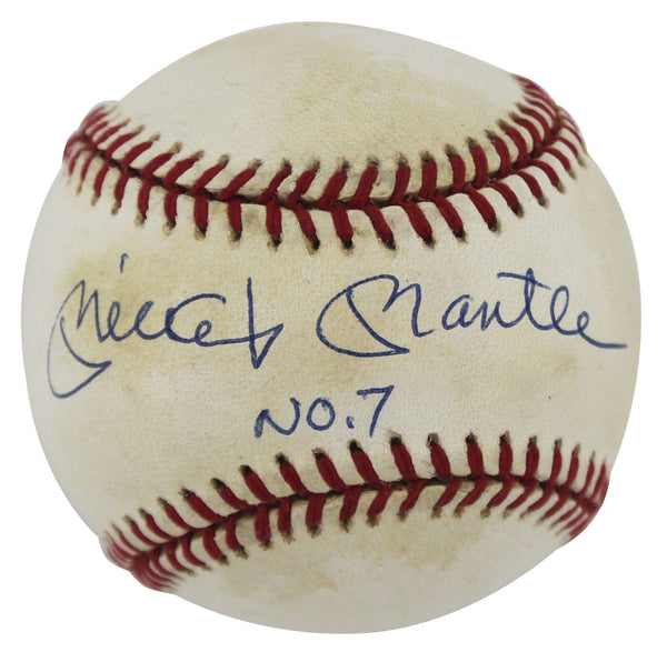 This Autographed Bobby Brown Oal Baseball with the inscription of "No. 7" has been Personally Signed by Mickey Mantle of the New York Yankees. This item is 100% Authentic to include a Certificate of Authenticity (COA) / hologram by UDA. The authenticity can be verified on Upper Deck Authentic website.