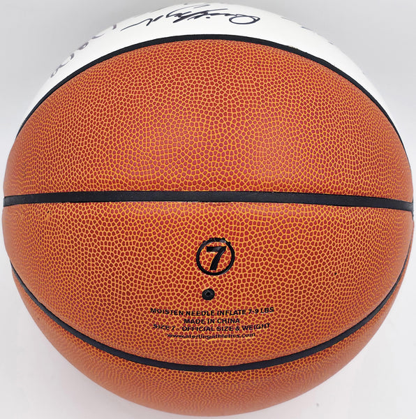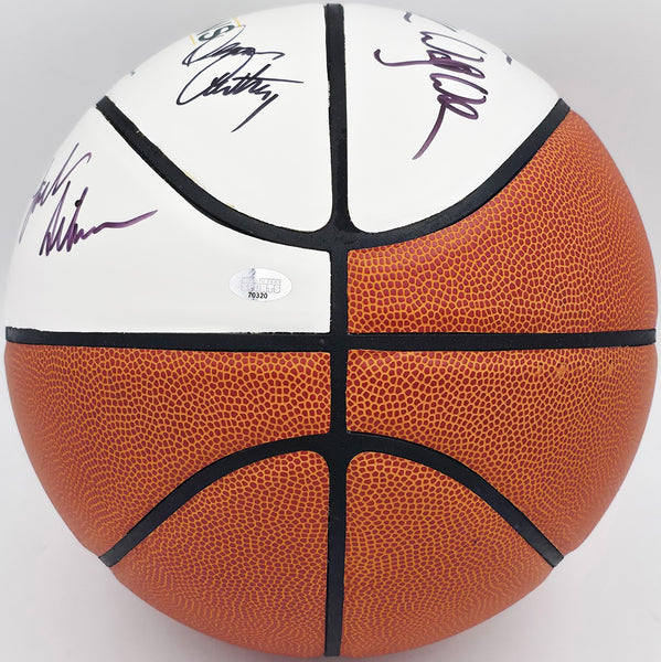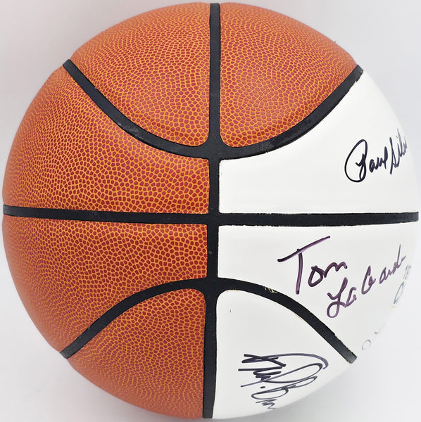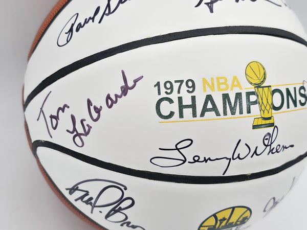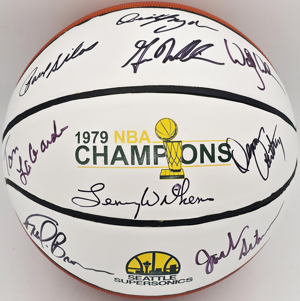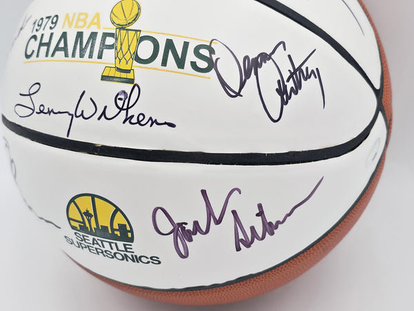 This is a White Logo Basketball that has been hand signed by 9 members of the 1978-79 NBA Champions Seattle Supersonics. This item was inscribed "HOF 89, 98, 10". Signatures include Lenny Wilkens, Fred Brown, Gus Williams, Jack Sikma, Paul Silas, Wally Walker, Dennis Awtrey, Dick Snyder & Tom LaGarde. There is a smudge in the signature as shown. This item was signed in the presence of a Mill Creek Sports representative and comes with their serial numbered hologram and matching certificate of authenticity.