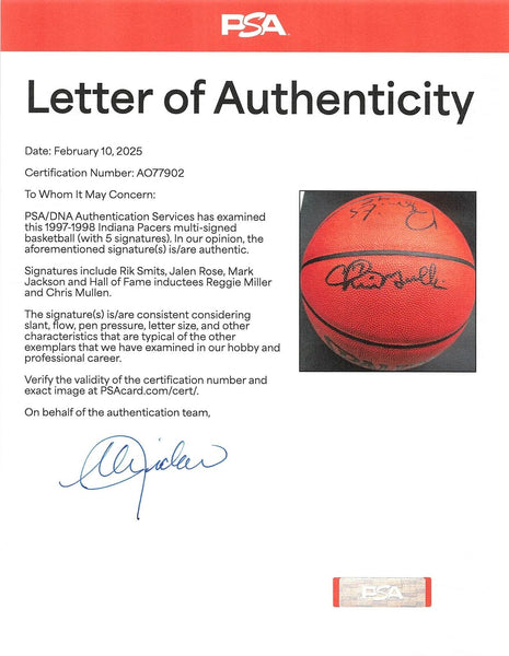 Spalding Basketball signed by the 1997-98 Indiana Pacers. The ball is signed by the following notable players: (All signatures have been authenticated by PSA/DNA) Rik Smits Jalen Rose Mark Jackson Reggie Miller Chris Mullin All the autographs on this basketball were authenticated by a team of experts at PSA/DNA and come with a Letter of Authenticity so you can rest assured you are purchasing the real deal. Don't miss your opportunity to own this one-of-a-kind basketball autographed by the 1997-98 Indiana Pacers.