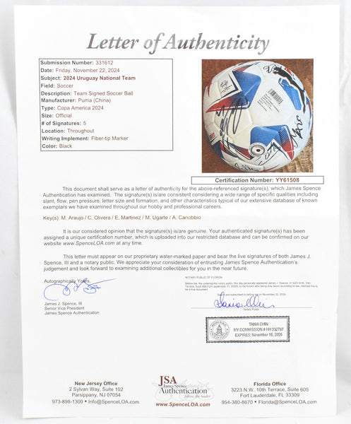 Araujo/ C. Olivera/ E. Martinez/ M. Ugarte/A. Canobbio Signed Soccer Ball JSA