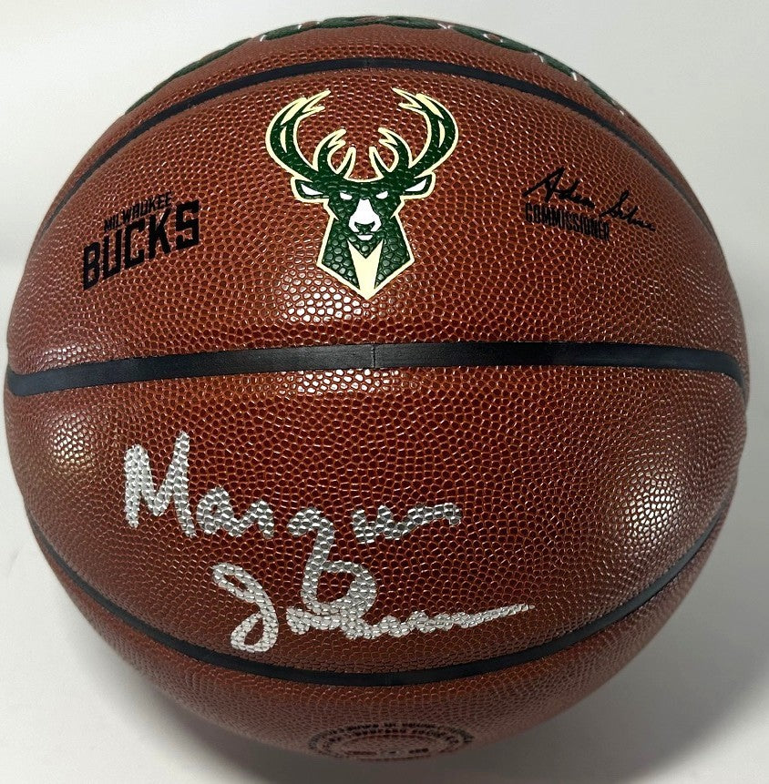 Wilson Full Size Replica BUCKS LOGO Basketball hand signed by Milwaukee Bucks Legend MARQUES JOHNSON. The signature is in Silver Paint Pen. This basketball was signed at a public signing with us and would make a great addition to any Bucks collection! This autograph is guaranteed to be 100% authentic and will include a COA hologram from Beckett authentication.