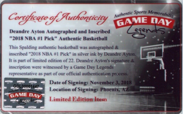 DEANDRE AYTON Autographed and Inscribed "2018 NBA #1 Pick" Authentic Spalding Basketball - Limited Edition of 22 - Super Sports Center & Steiner Sports Authenticated This basketball was autographed by Deandre Ayton with the inscription "2018 NBA #1 Pick." It is officially licensed by the National Basketball Association and comes with an individually numbered, tamper-evident hologram from Super Sports Center Authenticated as well as Steiner Sports Authentic. Your signed item can be identified and verified for authenticity by entering the serial number from your hologram into our online database. This process confirms and guarantees that your collectible is authentic and eliminates all possibility of duplication and fraud.This product is guaranteed authentic and includes a Super Sports Center Certificate of Authenticity and an accompanying tamper-evident hologram.