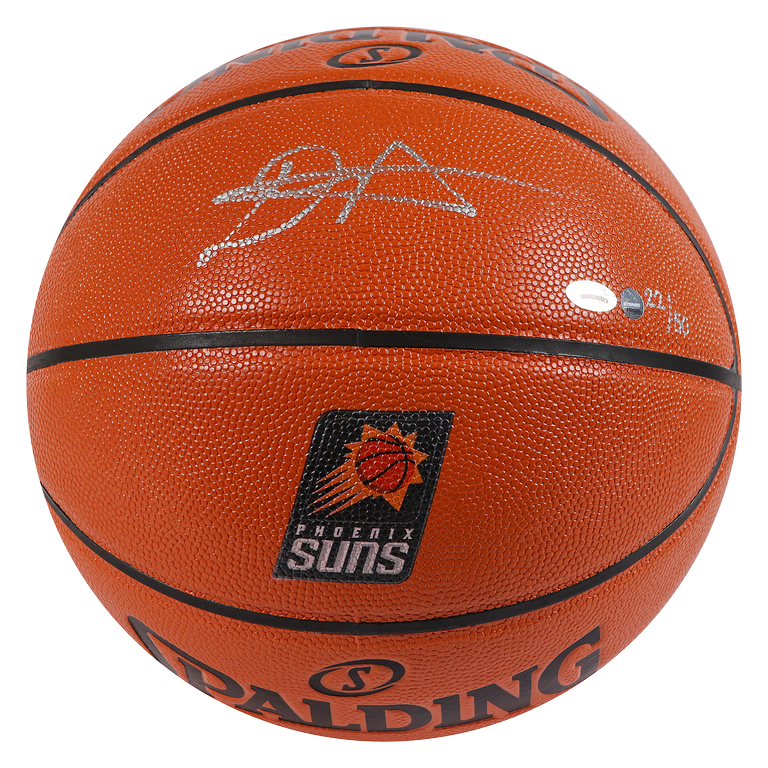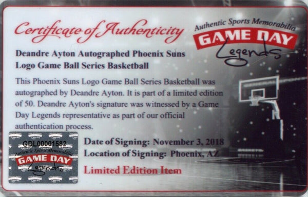 DEANDRE AYTON Autographed Phoenix Suns Logo Game Ball Series Spalding Basketball - Limited Edition of 50 - Super Sports Center & Steiner Sports Authenticated This basketball was autographed by Deandre Ayton. It is officially licensed by the National Basketball Association and comes with an individually numbered, tamper-evident hologram from Super Sports Center Authenticated as well as Steiner Sports Authentic. Your signed item can be identified and verified for authenticity by entering the serial number from your hologram into our online database. This process confirms and guarantees that your collectible is authentic and eliminates all possibility of duplication and fraud.This product is guaranteed authentic and includes a Super Sports Center Certificate of Authenticity and an accompanying tamper-evident hologram.