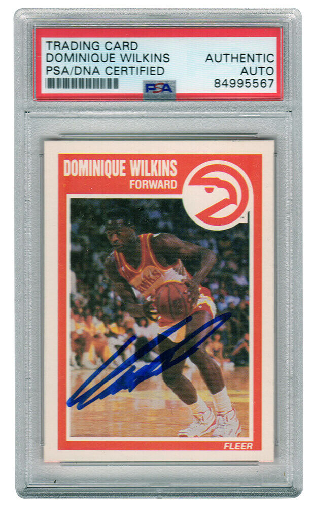 Dominique Wilkins signed Atlanta Hawks 1989-90 Fleer basketball trading card #7. The card has been authenticated and encapsulated by PSA/DNA and the number can be verified online. The image of the item is a stock photo, as we may have multiples of the item in stock. The Slabbed Card you will receive will be of the card described. (Same grade, Same authentication) You may or may not receive the exact PSA serial number on the slab label shown in image.