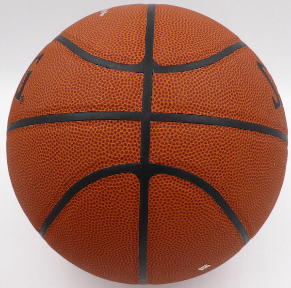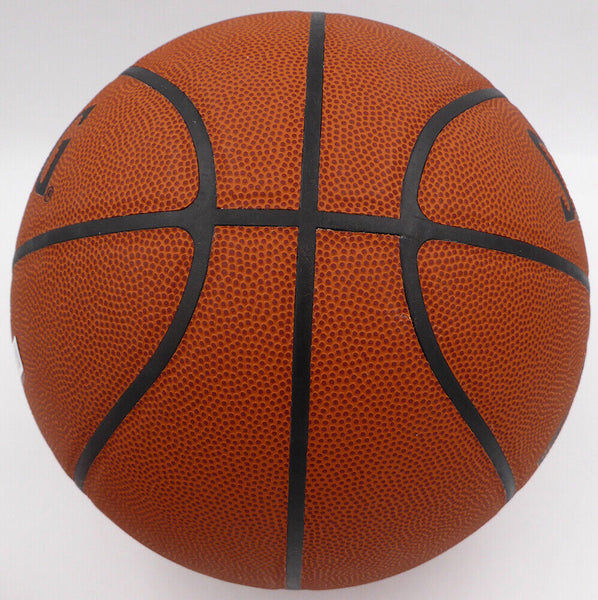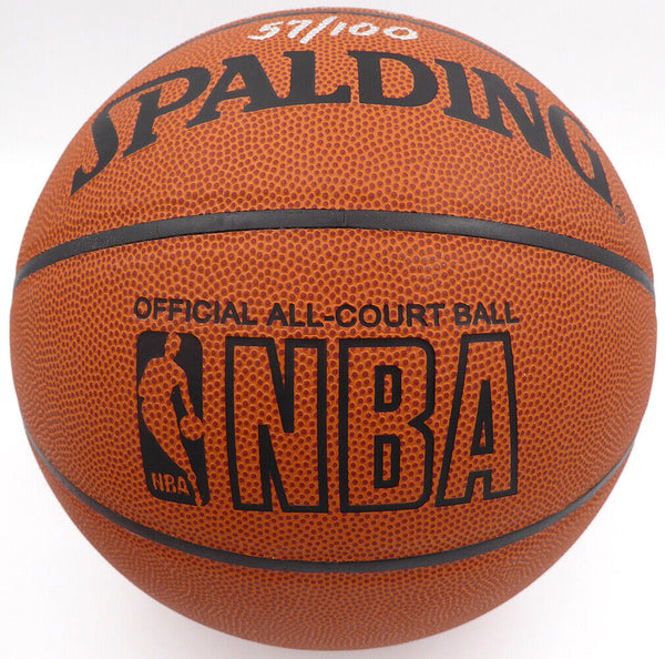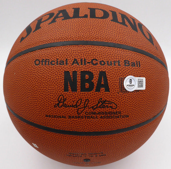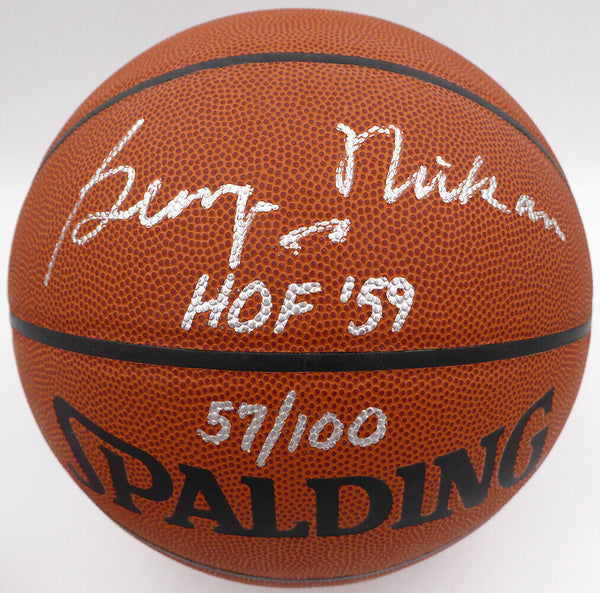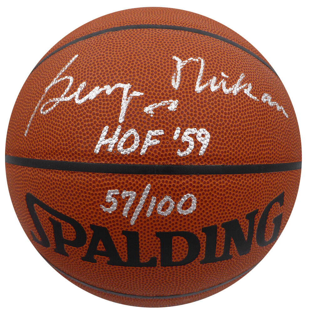 This is an Official Spalding Basketball that has been hand signed by George Mikan. This item was inscribed "HOF 59." This item has been certified authentic by Beckett Authentication (BAS) and comes with their tamper-proof QR Code sticker that can be verified on the Beckett-authentication.com. This is hand numbered 57/100.
