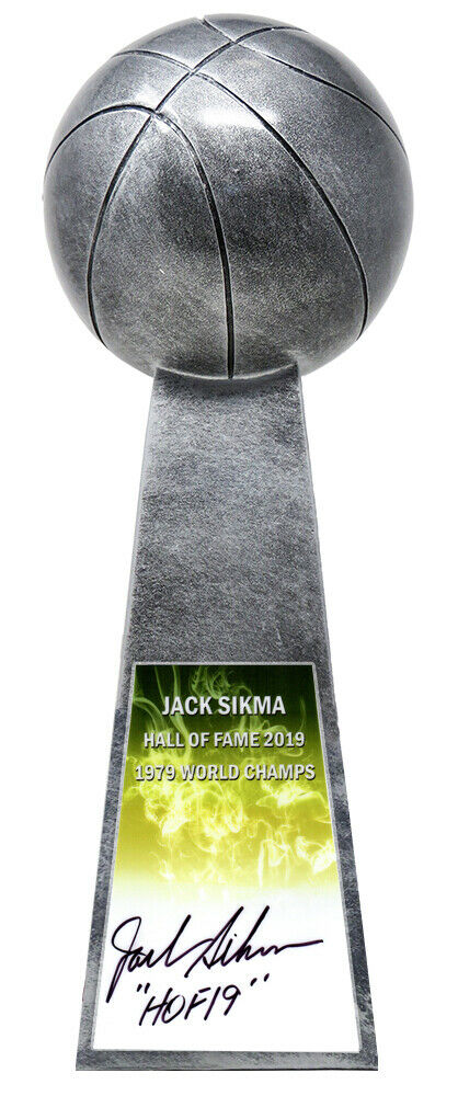 Jack Sikma signed basketball champion 14 inch replica silver trophy with 'HOF 19' inscription. Item comes with a Schwartz Sports Memorabilia tamper-proof numbered hologram and Certificate of Authenticity which can be verified online.