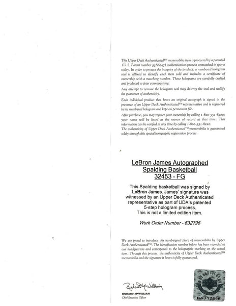 Featured is a Lebron James signed Spalding NBA basketball. This ball has been hand signed by James and comes with the Upper Deck hologram and certificate of authenticity. This ball would make a great addition to any sports memorabilia collection! SPECIFICATIONS Autographed By: Lebron James Team: Cleveland Cavaliers Sport: Basketball Authentication: Upper Deck Authenticated (UDA)