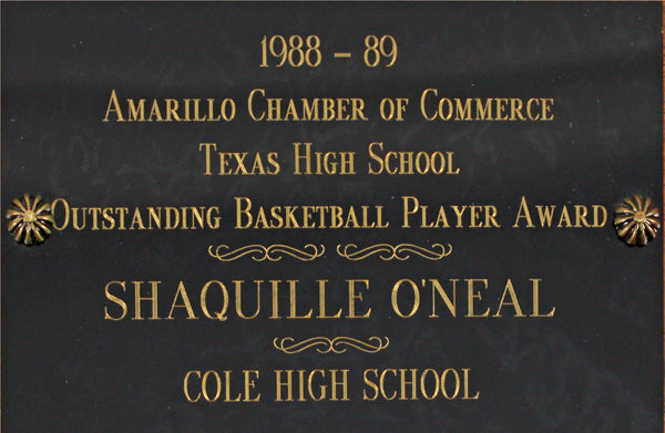 This 1989 Texas High School Outstanding Basketball Player Award Plaque has been Personally given to Shaquille O'Neal. This plaque measures approximately 12 x 12 inches. This plaque will come with a Letter of Provenance from Shaquille O'Neal. The signature on the Letter of Provenance was signed and witnessed by a Beckett representative.